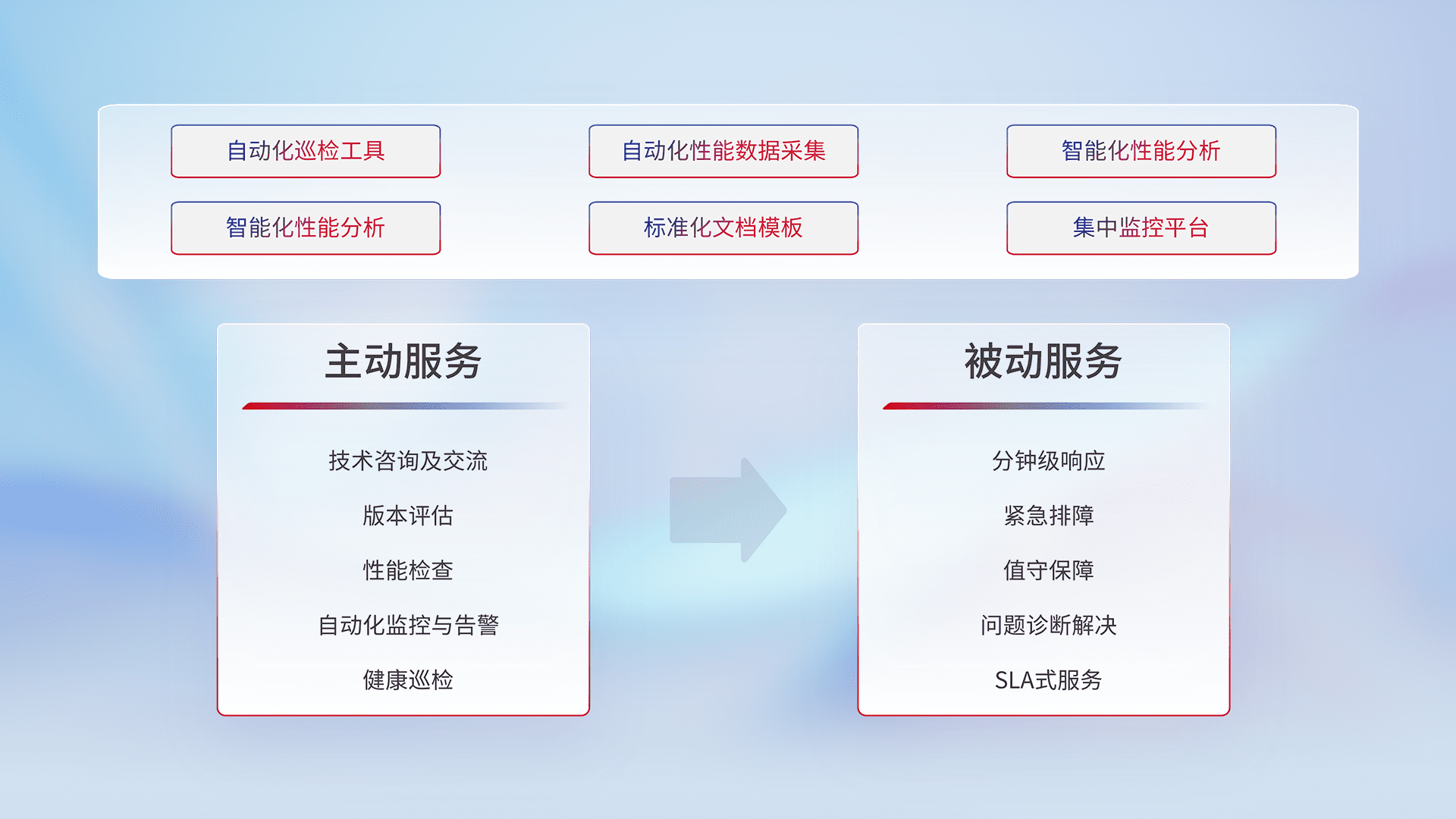 智能化工具和标准化文档,,保障服务质量,,,提供主动服务(包含技术咨询、、、、版本评估、、、性能检查、、、、自动化监控与告警、、、健康巡检)和被动服务包含(分钟级响应、、、、紧急排障、、、、值守保障、、问题诊断解决、、SLA服务)。。